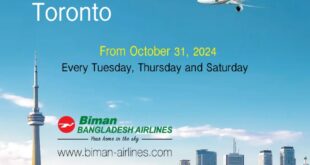 বিমান বাংলাদেশ এয়ারলাইন্স এর ঢাকা-টরন্টো-ঢাকা রুটে ৩১ শে অক্টোবর ২০২৪ তারিখ (শীতকালীন সূচি) থেকে প্রতি বৃহস্পতিবার অতিরিক্ত একটি ফ্লাইট ফ্রিকোয়েন্সি যোগ করা হয়েছে। এর ফলে ৩১ শে অক্টোবর থেকে ঢাকা-টরন্টো-ঢাকা রুটে সপ্তাহে প্রতি শনিবার, মঙ্গলবার ও বৃহস্পতিবার তিনটি ফ্লাইট চলবে। বর্তমানে মঙ্গলবার ও শনিবারে ১টি করে ফ্লাইট পরিচালিত হচ্ছে। ইতোমধ্যে …