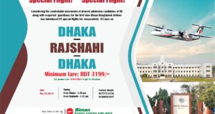 রাজশাহী বিশ্ববিদ্যালয়ে সম্মানিত ভর্তি পরীক্ষার্থী ও অভিভাবকবৃন্দের যাতায়াত সুবিধার কথা বিবেচনা করে বিমান বাংলাদেশ এয়ারলাইন্স ঢাকা-রাজশাহী-ঢাকা রুটে ২৯, ৩০ ও ৩১শে মে তিনটি বিশেষ ফ্লাইট পরিচালনা করবে। ফ্লাইট গুলো ঢাকা থেকে বিকাল ০৩:৩০টায় যাত্রা করে রাজশাহী পৌছাবে বিকাল ০৪:২০ টায় এবং রাজশাহী থেকে বিকাল ০৪:৪৫টায় ছেড়ে এসে ঢাকায় পৌঁছাবে বিকাল …